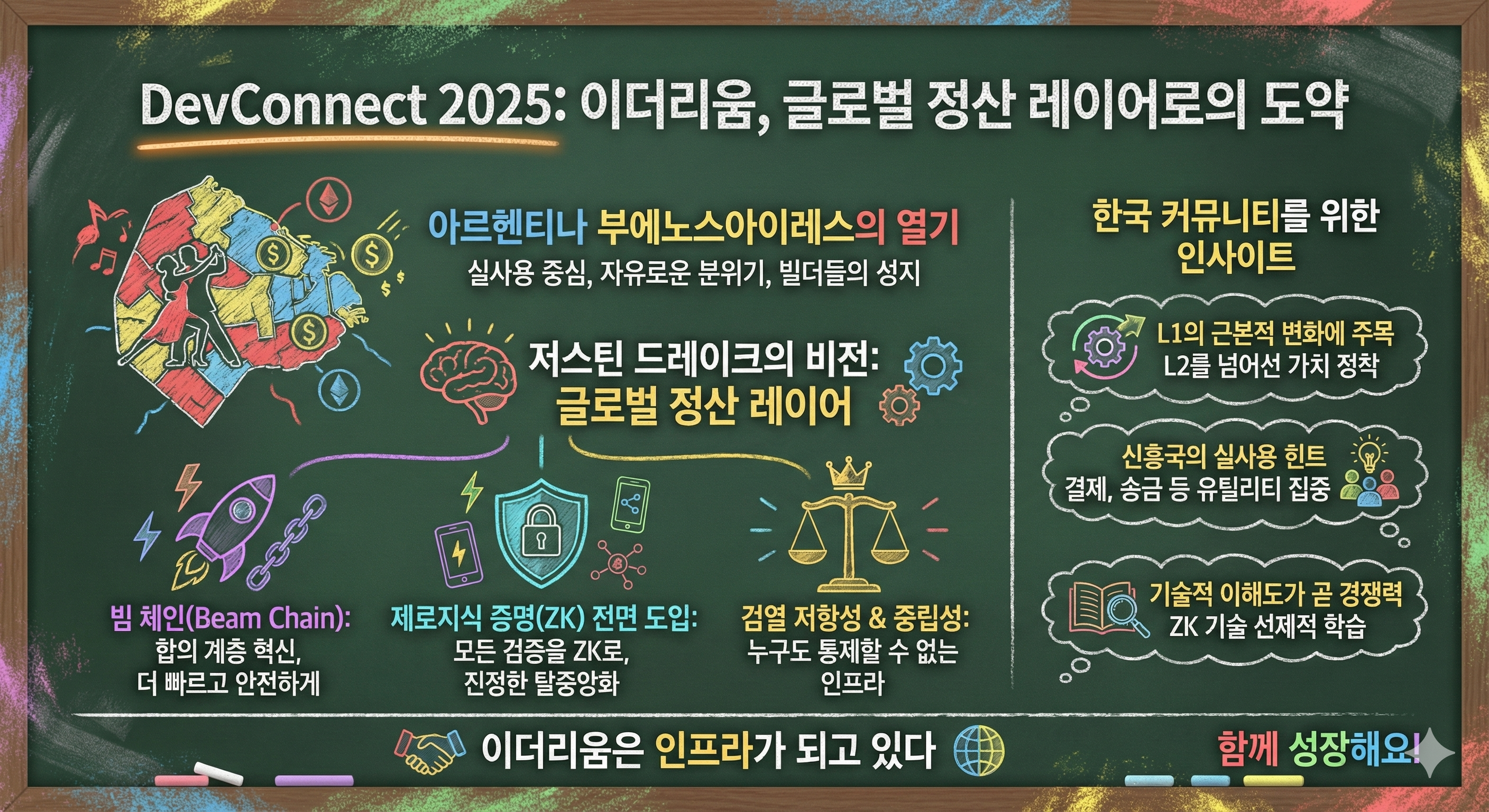 아르헨티나 부에노스아이레스의 뜨거운 열기 속에서 진행된 DevConnect 2025 현장에 다녀왔습니다. 남미 특유의 열정적인 에너지와 전 세계에서 모여든 개발자들의 지적인 호기심이 뒤섞여 행사장 주변은 그 어느 때보다 활기찼습니다. 특히 이번 행사에서는 단순한 기술적 논의를 넘어, 블록체인이 실질적으로 인류의 경제 시스템에 어떻게 녹아들 것인가에 대한 깊이 있는 통찰들이 쏟아졌습니다.그중에서도 가장 인상 깊었던 비탈릭 부테린의 세션 내용을 중심으로, 현장의 감동과 제가 느낀 고민들을 정리해 보았습니다. 현장의 분위기: 기술과 열정이 만나는 지점행사장에 들어서자마자 느낀 것은 이더리움 생태계가 이제는 성숙기를 지나 하나의 거대한 인프라로 자리 잡고 있다는 확신이었습니다. 아르헨티나는 인플레이션 등 경제적..
