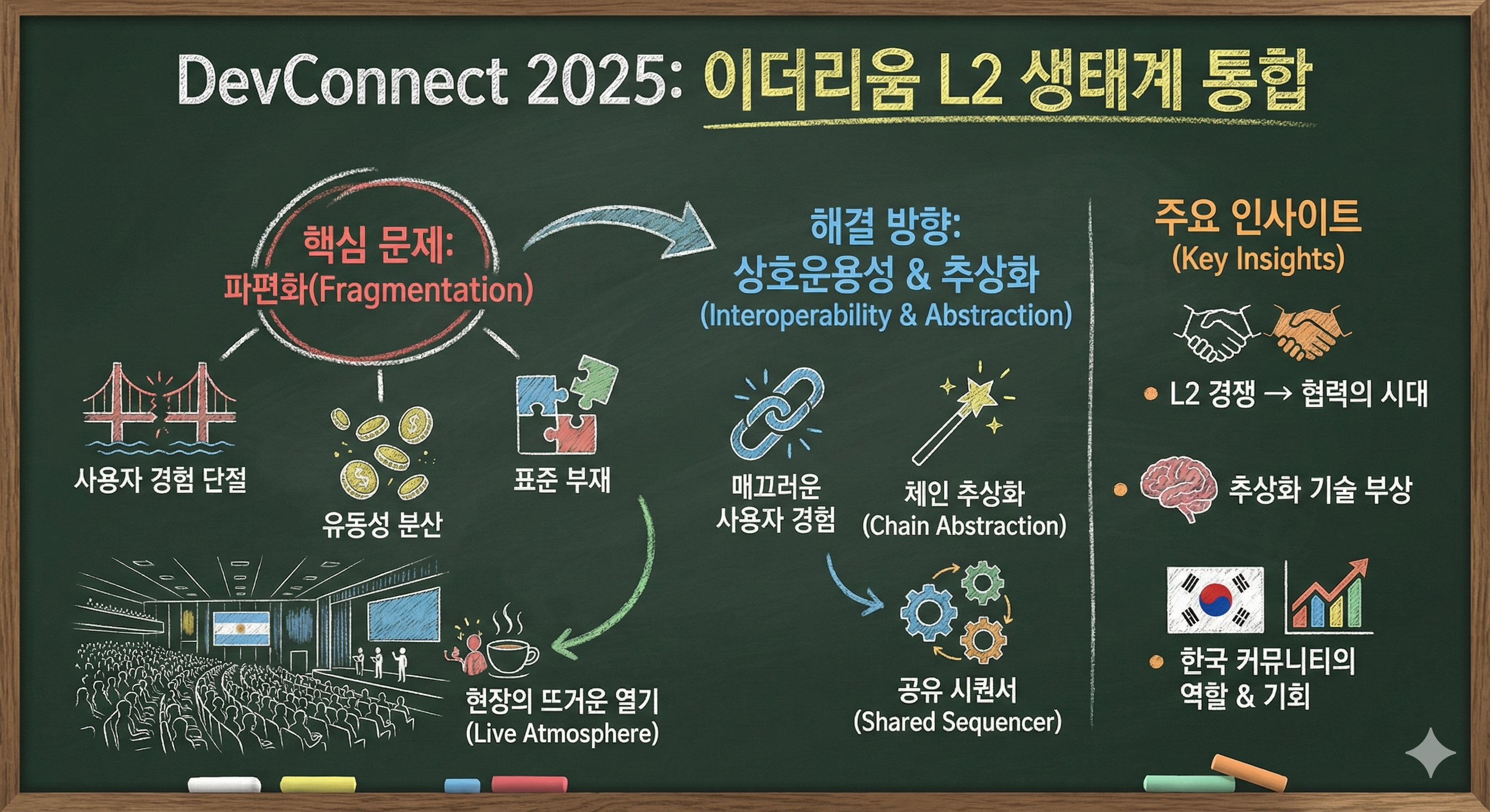 아르헨티나에서 느낀 이더리움의 심장박동이번 DevConnect가 열린 부에노스아이레스는 그 어느 곳보다 암호화폐에 대한 열망이 뜨거운 곳이었습니다. 행사장 주변은 전 세계에서 모여든 개발자들과 현지 커뮤니티의 에너지로 가득 찼고, 단순히 '기술적인 논의'를 넘어 이 기술이 실제 삶을 어떻게 바꿀 수 있을지에 대한 진지한 고민들이 오갔습니다.특히 이번 세션이 진행된 메인 홀은 빈자리를 찾기 힘들 정도로 붐볐습니다. 모두의 시선은 하나로 모여 있었습니다. **"수많은 레이어 2들로 흩어진 이더리움을 어떻게 다시 하나로 묶을 것인가?"**라는 질문에 대한 답을 듣기 위해서였죠. 세션 핵심 내용: "파편화(Fragmentation)를 해결하라"발표의 핵심은 명확했습니다. 현재 이더리움은 레이어 2 솔루션들을 통..