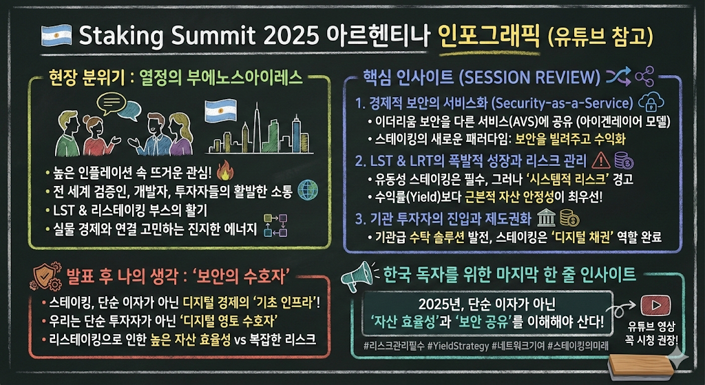 아르헨티나의 뜨거운 태양 아래서 확인한 스테이킹의 미래는 매우 밝았습니다. 하지만 그 밝은 미래 뒤에는 철저한 리스크 관리와 기술적 이해가 뒷받침되어야 합니다. 이번 Staking Summit 2025에서 얻은 배움이 여러분의 투자 여정에 소중한 이정표가 되길 바랍니다.