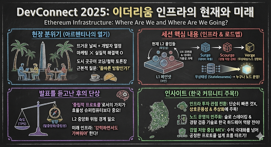 DevConnect 2025 아르헨티나 일정은 저에게 큰 자극이 되었습니다. 우리가 매일 사용하는 지갑과 앱 뒤편에는 이토록 치열한 인프라적 고민과 투쟁이 숨어 있다는 사실을 다시금 깨닫습니다.