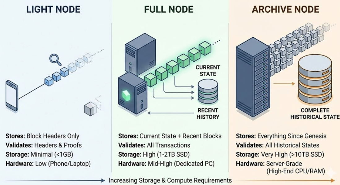 중요한 점은 아카이브 노드와 달리 모든 과거 이력을 다 들고 있지는 않다는 것입니다. 풀 노드는 최신 상태를 유지하면서, 너무 오래된 데이터는 가지치기(Pruning)를 통해 용량을 관리합니다. 하지만 네트워크의 무결성을 검증하고 내 트랜잭션을 직접 전파하기에는 충분하죠.