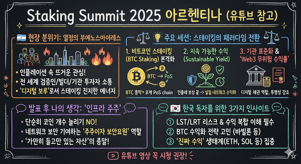 아르헨티나의 뜨거운 태양 아래서 확인한 스테이킹의 미래는 '성숙함' 그 자체였습니다. 투기적인 거품이 걷히고, 이제는 정말로 **'금융 인프라로서의 블록체인'**이 자리를 잡아가고 있다는 인상을 받았습니다.