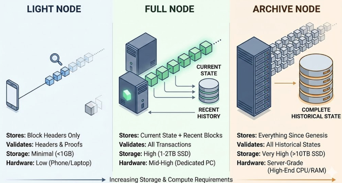 일반적인 풀 노드는 최신 상태를 유지하기 위해 오래된 데이터를 가지치기(Pruning)합니다. 하지만 아카이브 노드는 제네시스 블록부터 현재까지 모든 블록의 중간 상태 값을 저장합니다.