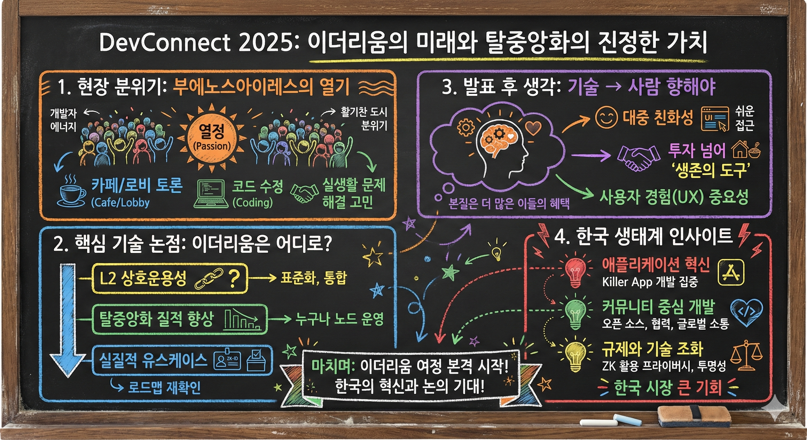 1. 부에노스아이레스에서 느낀 뜨거운 현장 분위기이번 DevConnect가 열린 아르헨티나는 현재 전 세계에서 암호화폐가 가장 '실질적으로' 사용되는 국가 중 하나입니다. 그래서일까요? 행사장인 부에노스아이레스의 분위기는 여타 도시와는 확연히 달랐습니다.행사장 입구부터 전 세계에서 모여든 개발자들의 열띤 토론 소리가 가득했고, 복도 곳곳에서는 즉석에서 화이트보드에 수식을 써가며 프로토콜의 개선안을 논의하는 모습이 보였습니다. 특히 아르헨티나 현지인들이 일상에서 스테이블코인을 사용하는 모습과 기술적 담론이 결합되면서, **"블록체인은 더 이상 이론이 아니라 생존이자 생활"**이라는 에너지가 강하게 느껴졌습니다.세션장은 빈자리를 찾기 힘들 정도로 꽉 찼고, 발표자의 한 마디 한 마디에 청중들은 깊은 몰입감을..