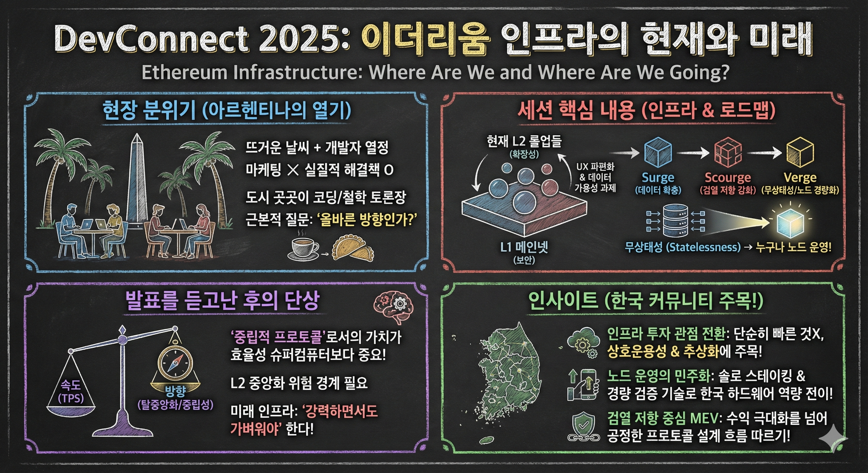 아르헨티나 부에노스아이레스에서 열린 DevConnect 2025에 다녀왔습니다. 이곳은 단순한 컨퍼런스 이상의 의미를 가집니다. 도시 곳곳에서 개발자들이 랩탑을 펴고 코드와 철학을 논하는 모습은 이더리움이 지향하는 탈중앙화된 미래를 그대로 보여주는 듯했습니다.특히 이번 행사에서 가장 깊은 인상을 남겼던 "Ethereum Infrastructure: Where Are We and Where Are We Going?" 세션을 통해 얻은 인사이트와 현장의 열기를 한국의 커뮤니티 여러분께 전해드리고자 합니다. 🇦🇷 현장의 분위기: 아르헨티나의 열정과 빌더들의 집념부에노스아이레스는 암호화폐에 대한 이해도가 매우 높은 도시입니다. 그래서인지 이번 DevConnect의 분위기는 그 어느 때보다 진지하고 뜨거웠습니..