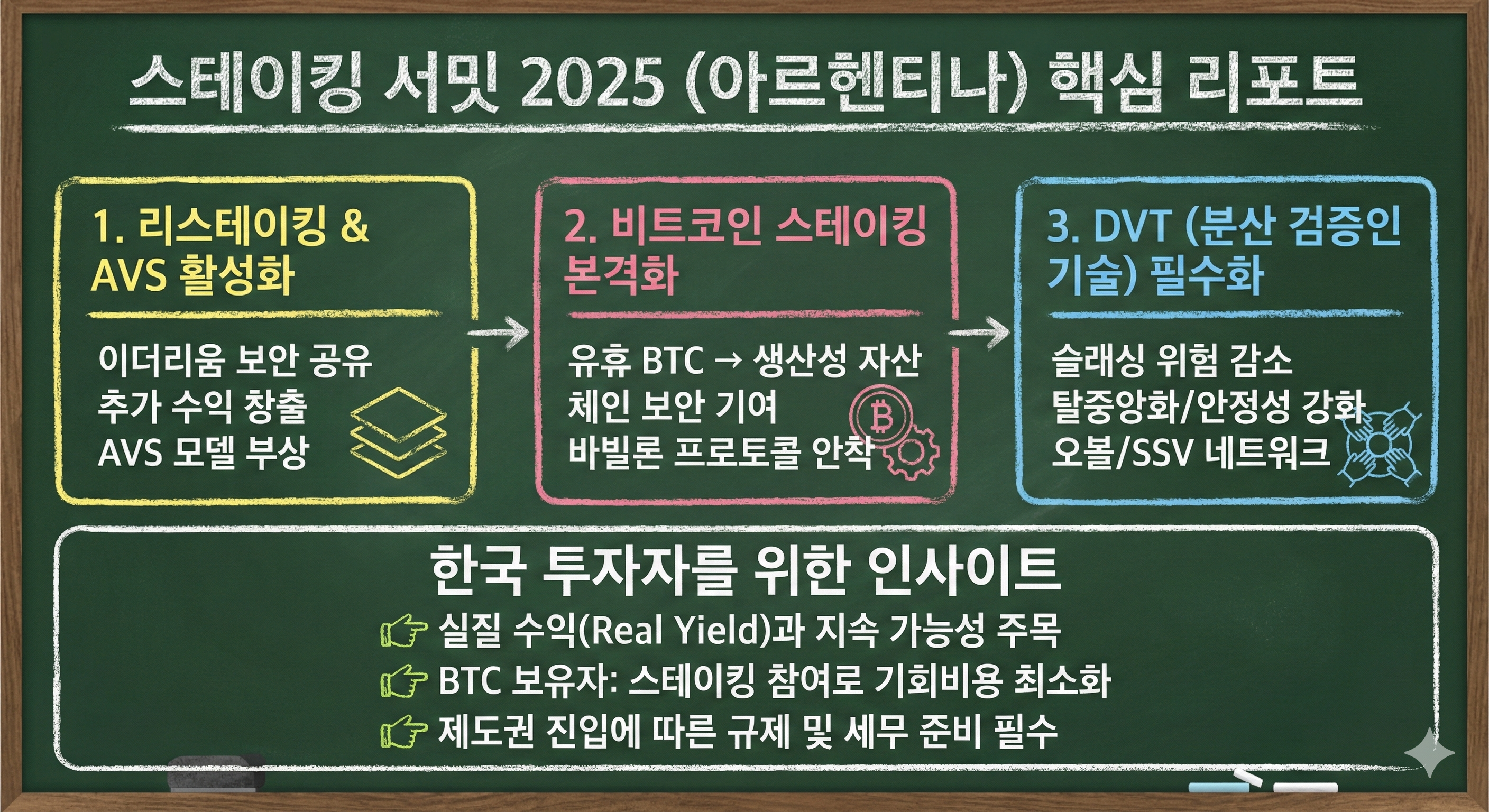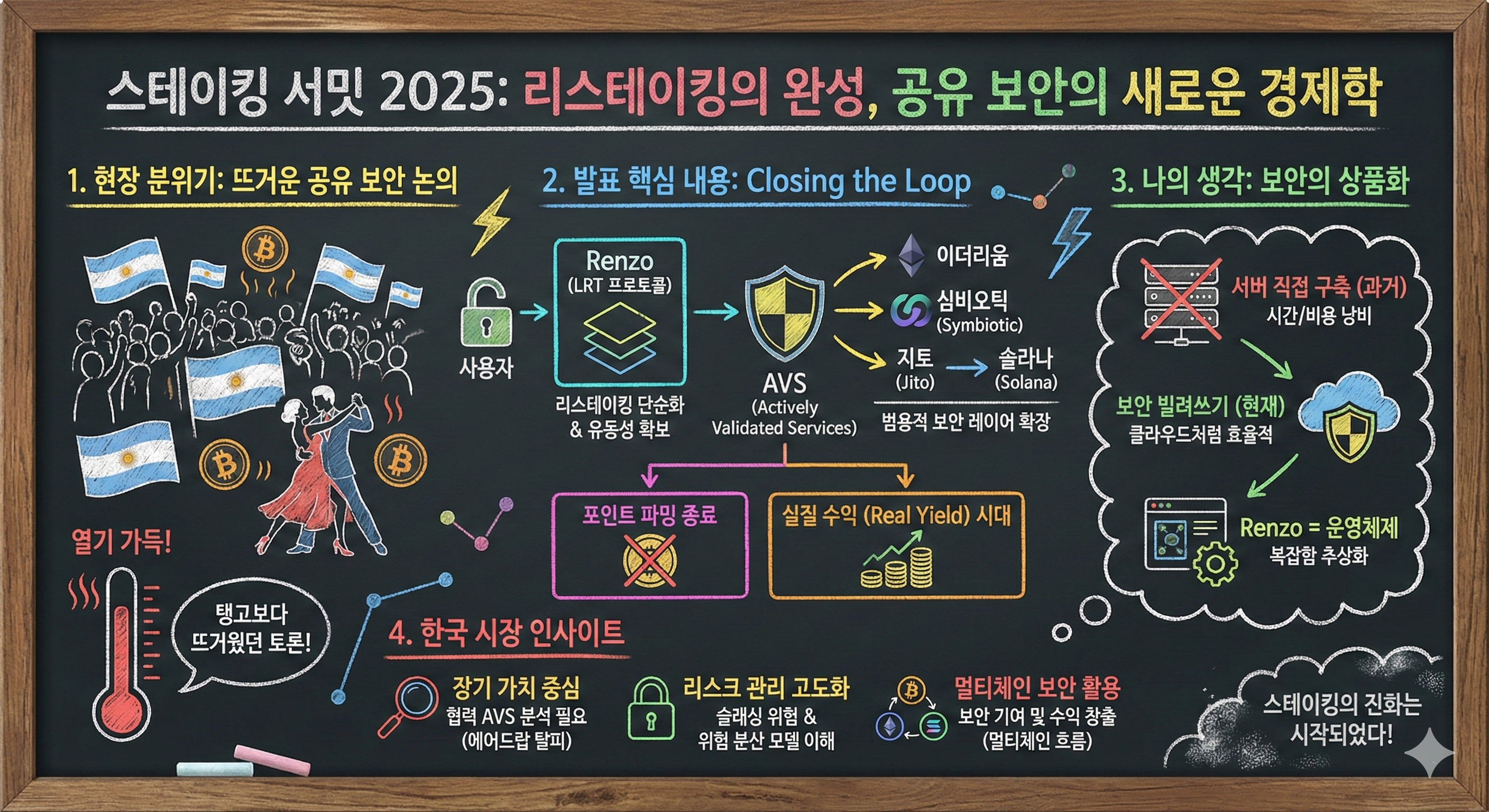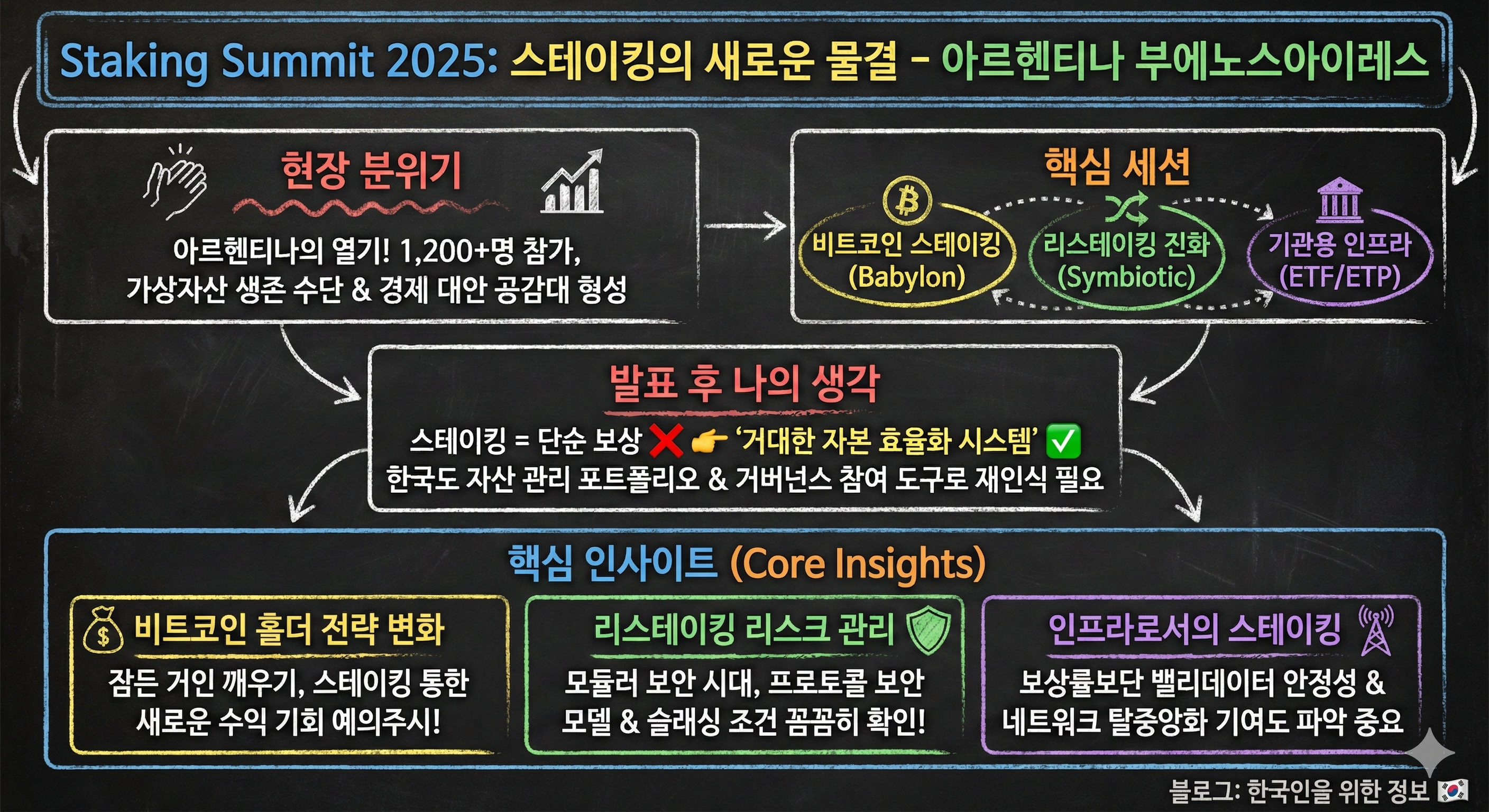 아르헨티나 부에노스아이레스의 뜨거운 열기 속에서 개최된 Staking Summit 2025는 블록체인 생태계가 이제 막연한 기대를 넘어 실질적인 금융 인프라의 단계로 진입했음을 여실히 보여준 자리였습니다. 11월 15일부터 16일까지 이틀간 쉐라톤 호텔에서 열린 이번 서밋은 전 세계의 밸리데이터, 프로토콜 빌더, 그리고 기관 투자자들이 한데 모여 스테이킹의 미래를 논의하는 장이었습니다.현장에서 직접 보고 느낀 생생한 기록과 함께, 한국 시장의 투자자 및 관계자분들이 주목해야 할 핵심 인사이트를 정리해 보았습니다. 1. 부에노스아이레스 현장의 생생한 열기이번 서밋이 열린 아르헨티나는 매우 상징적인 장소였습니다. 높은 인플레이션을 겪고 있는 현지인들에게 가상자산은 이미 일상적인 경제적 대안이었고, 그래서인지..
